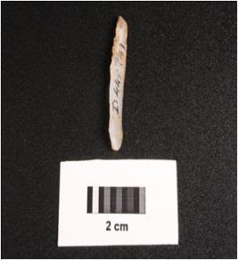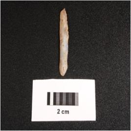 | Description / विवरण | Microlithic blade on chalcedony with prominent wavy mid ridge on dorsal. Triangular in section, use wear marks on cutting edges and diffused bulb on ventral. |