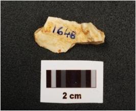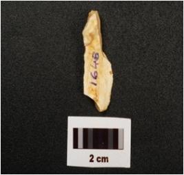 | Description / विवरण | A chert blade with mid ridge on dorsal side triangular section and use wear marks on working edge. |