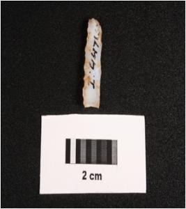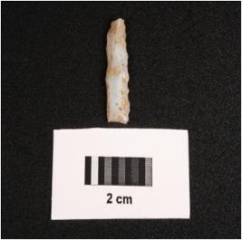 | Description / विवरण | Microlithic blade on chalcedony, prominent mid ridge on dorsal, triangular in section and use wear marks along the cutting edges. |