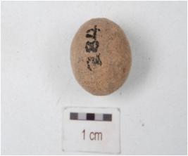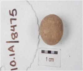 | Description / विवरण | A small spherical shaped terracotta sling ball with red slipped surface. |
