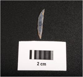 | Description / विवरण | Microlithic backed blade with use wear marks on one cutting edge, single ridge on dorsal and smooth vertral. |