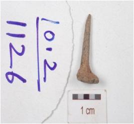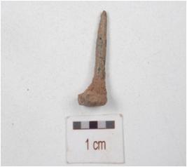 | Description / विवरण | A iron nail with rectangular in section, tapering to a pointed end, broken flat rounded head and rough surface. |