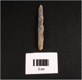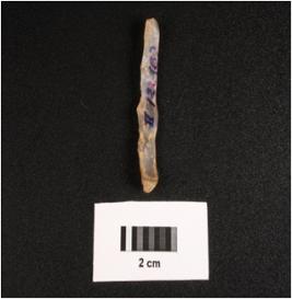 | Description / विवरण | Parallel sided microlith blade with use wear marks on cutting edges, prominent mid ridge on dorsal, broken at distal end and diffused bulb on ventral. |