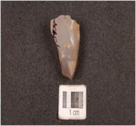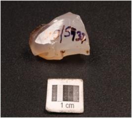 | Description / विवरण | A core made on chalcedony seven flake scars on surface, prepared platform, conical in shape and white in colour. |