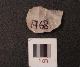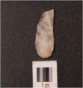 | Description / विवरण | Point made on quartz, four flake scars and distal end broken. |