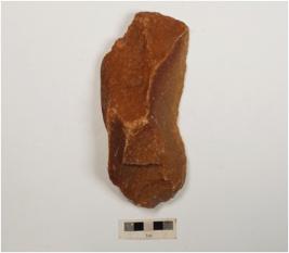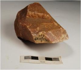 | Description / विवरण | A unifacial side scraper on side struck flake made on quartzite with flake scars and cortex on surface, bulb and irregular retouches on cutting edge and tool made by applying block-on-block technique. |