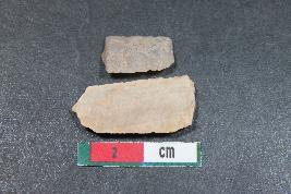 | Description / विवरण | Fragment of blades with one dorsal ridge having smooth surface. Shorter fragment has Length equivalent to 1.3 cm. |