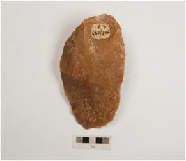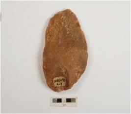 | Description / विवरण | A unifacial handaxe on side struck flake and flake scars on surface, bulb on ventral and irregular retouches on working edge. |