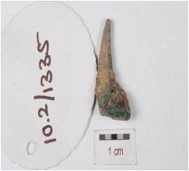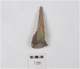 | Description / विवरण | A copper nail with narrow body pointed end and broad extended head with corroded surface. |