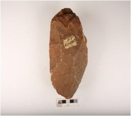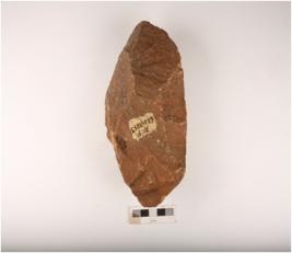 | Description / विवरण | Quartzite handaxe with flake scars on both sides, edges sharpened by block-on-block technique and prepared platform. |