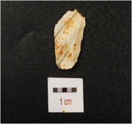| Description / विवरण | A chert flake is irregular shaped and natural lines on the surface. |