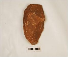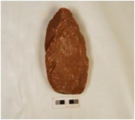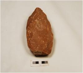 | Description / विवरण | A handaxe made on quartzite stone, flaking scars are visible on both sides and irregular re-touching on edges. |