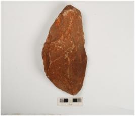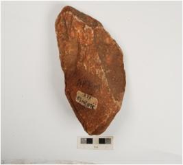 | Description / विवरण | A handaxe made on quartzite pebble by block-on-block technique, flake scars on both sides and sharp cutting edges on both sides. |
