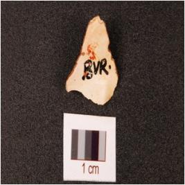 | Description / विवरण | A flake made on chert, uneven surface, irregular retouching marks on one end, prepared platform on dorsal side. |