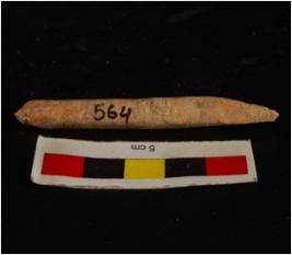 | Description / विवरण | Fragment of a bone point with mud incrustation, slightly broken, and circular in section. |