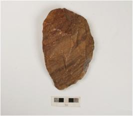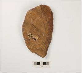 | Description / विवरण | A bifacial ovate handaxe, made on quartzite with flake scars on both sides, cortex on thick end and irregular retouches on working edge. |