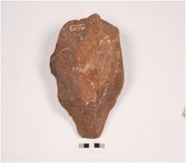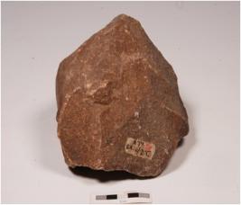 | Description / विवरण | A quartzite stone handaxe, made on side struck bebble flakes on both side and irregular retouches at cutting edge. |