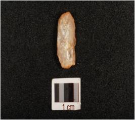 | Description / विवरण | Unfinished lunated made on quartz with sharp working edge at one side, blunted other side, ridge visible on surface, use ware marks along the cutting edge, intact both ends, bulb absent, |