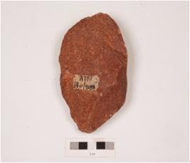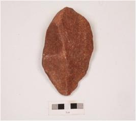| Description / विवरण | A handaxe of quartzite made on a pebble with flake scars on the surface, prepared platform, bulb on the ventral side and irregular retouch along the working edges. |
