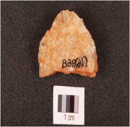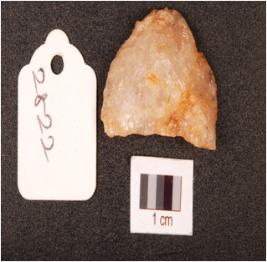 | Description / विवरण | A utitized flake on quartz, convex edge with use-wear mark, flake scars on dorsal side. |