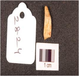 | Description / विवरण | Fragment of a point on quartz blade, prepared platform on proximal end, diffused bulb on ventral side, broken along distal end, tapering towards distal end. |