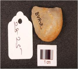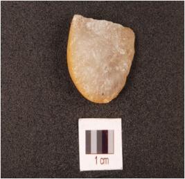 | Description / विवरण | Fragment of a flake on quartz, broken along proximal end, cortex on dorsal side, one sharp lateral edge with use-wear marks, other lateral edge naturally blunted. |