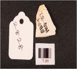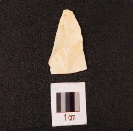 | Description / विवरण | Fragment of a blade on chert, broken along proximal end ridge and flake scars on dorsal side, use-wear marks along the cutting edges. |