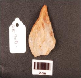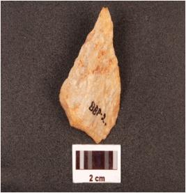 | Description / विवरण | A point on end, struck flake, prepared platform, prominent bulb on ventral side, ridge on dorsal side, pointed distal end. |