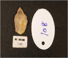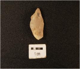| Description / विवरण | A point made on quartz flake with a ridge on dorsal side and distal end broken. |