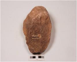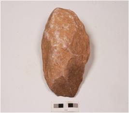 | Description / विवरण | A hand axe on pebble alternative flaking by block on block technique, cortex on both dorsal and ventral side, flat sharp top, weavy, sharp lateral cutting edges, thick butt end. |