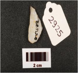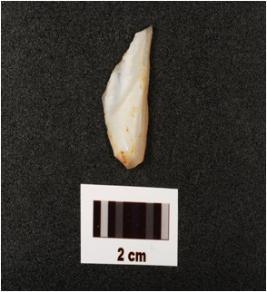 | Description / विवरण | Fragment of flake, made on milky quartz, platform and bulb absent, pointed at distal end, flake scars visible on dorsal surface, sharp edge on one side, |