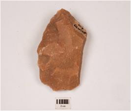 | Description / विवरण | A handaxe made on a quartzite pebble with flake scars on both sides, irregularly retouched edges and made by employing block on block technique. |