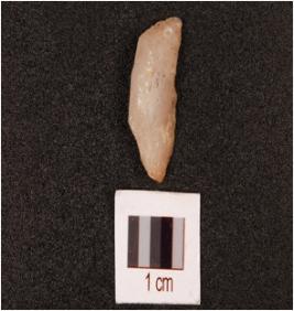 | Description / विवरण | A lunate on quartz with one sharp edge, other edge blunted with retouches, bulb and platform absent. |