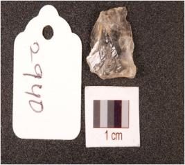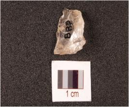| Description / विवरण | Fragment of a blade on quartz crystal, broken along proximal end, ridge on dorsal side, use-wear marks along cutting edges bulb, platform absent. |