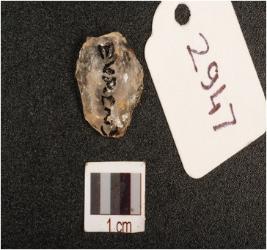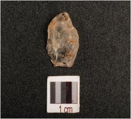 | Description / विवरण | Parallel sided blade made on quartz with blunted working edges, broken at proximal end, intact distal end, platform and bulb absent, flake scars visible on dorsal surface, |