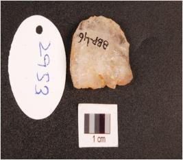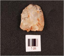 | Description / विवरण | A discoid scraper on end struck quartz flake convex cutting edge with use-wear marks on cutting edge, prepared platform on proximal end, diffused bulb on ventral side. |