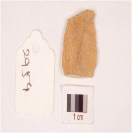 | Description / विवरण | Fragment of parallel sided blade on chert, broken along proximal end, intact distal end, ridge on dorsal side use-wear marks along cutting edges. |