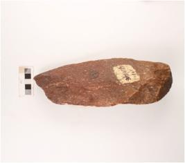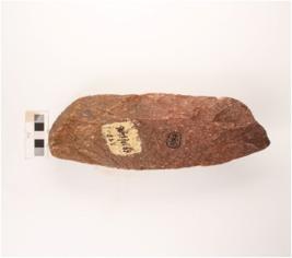 | Description / विवरण | Handaxe, broken at enterior end, striking platform on posterior end with cortex and flake scars on one side. |