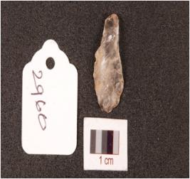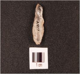 | Description / विवरण | A parallel sided blade on quartz crystal, on proximal end, diffused bulb on ventral side ridge on dorsal side, use-wear marks along the cutting edges. |