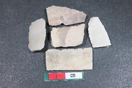 | Description / विवरण | Fragments of blades having one dorsal ridge in two of them and two dorsal ridges in three of them. One of them has bulb of percussion.They have smooth surface. |
