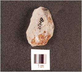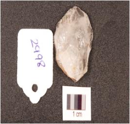 | Description / विवरण | A scraper made on quartz, distal end is broken, flake marks on dorsal side, diffused bulb on proximal end, and irregular retouching marks on edge. |