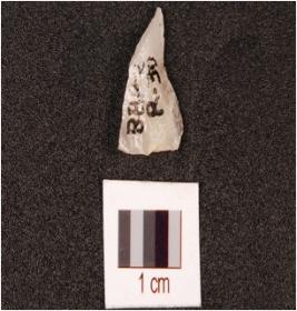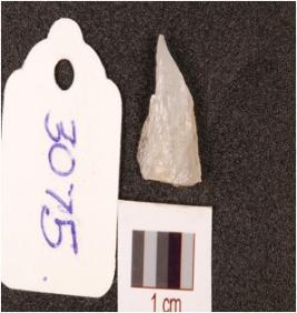 | Description / विवरण | A fragment of blade made on quartz, mid ridge on dorsal side, irregular retouching marks on edge, flake marks on surface. |