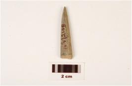 | Description / विवरण | A stone long point with smooth surface, pointed one end other end broken, plano convex in section and grey in colour. |