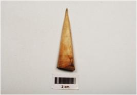 | Description / विवरण | A bone point, polished surface with a pointed end, thick and broad at other end light brown in colour. |