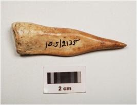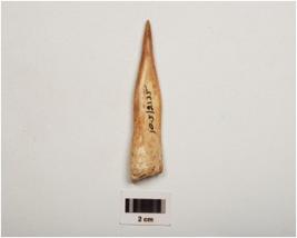 | Description / विवरण | A bone point, polished surface with a pointed end, thick and broad at other end and light brown in colour. |