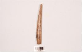 | Description / विवरण | Bone point with a polished surface, pointed end, hollow surface visible on one side and cut marks visible on surface. |