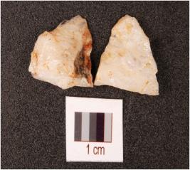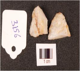 | Description / विवरण | A flake made on quartz broken in two pieces, uneven surface, irregular retouching marks on edge. |