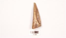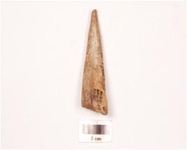 | Description / विवरण | Bone arrow head with one end pointed, other end broad, polished surface and hollow at one side. |