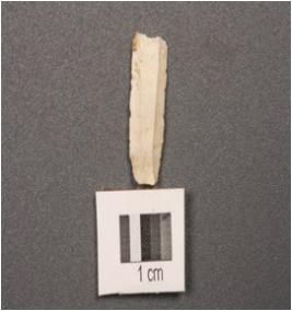 | Description / विवरण | Chert parallel sided blade with double ridge, used wear mark on cutting edges, trapezoidal section, prominent bulb on ventral side. |