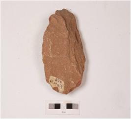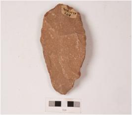 | Description / विवरण | Handaxe made on a quartzite with flake scars on both sides, irregularly retouched edge, made by employing soft hammer technique. |
